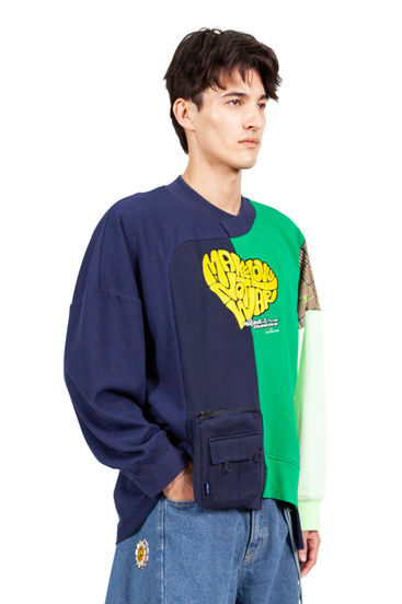 Deconstructed Mixed-fabric Sweater in long sleeve. Cut and sewn from Love-check fabric, green, mint and navy cotton knit fabric. Embriodered heart-shaped "Make Love Not War" logo. Pocket detached into a functioning sling bag with flap pockets and zippered compartment. Unisex.